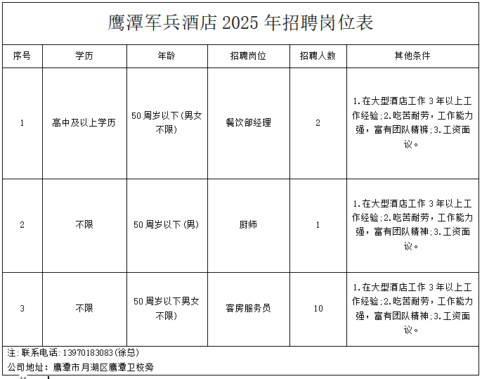 鹰潭军兵酒店2025年招聘